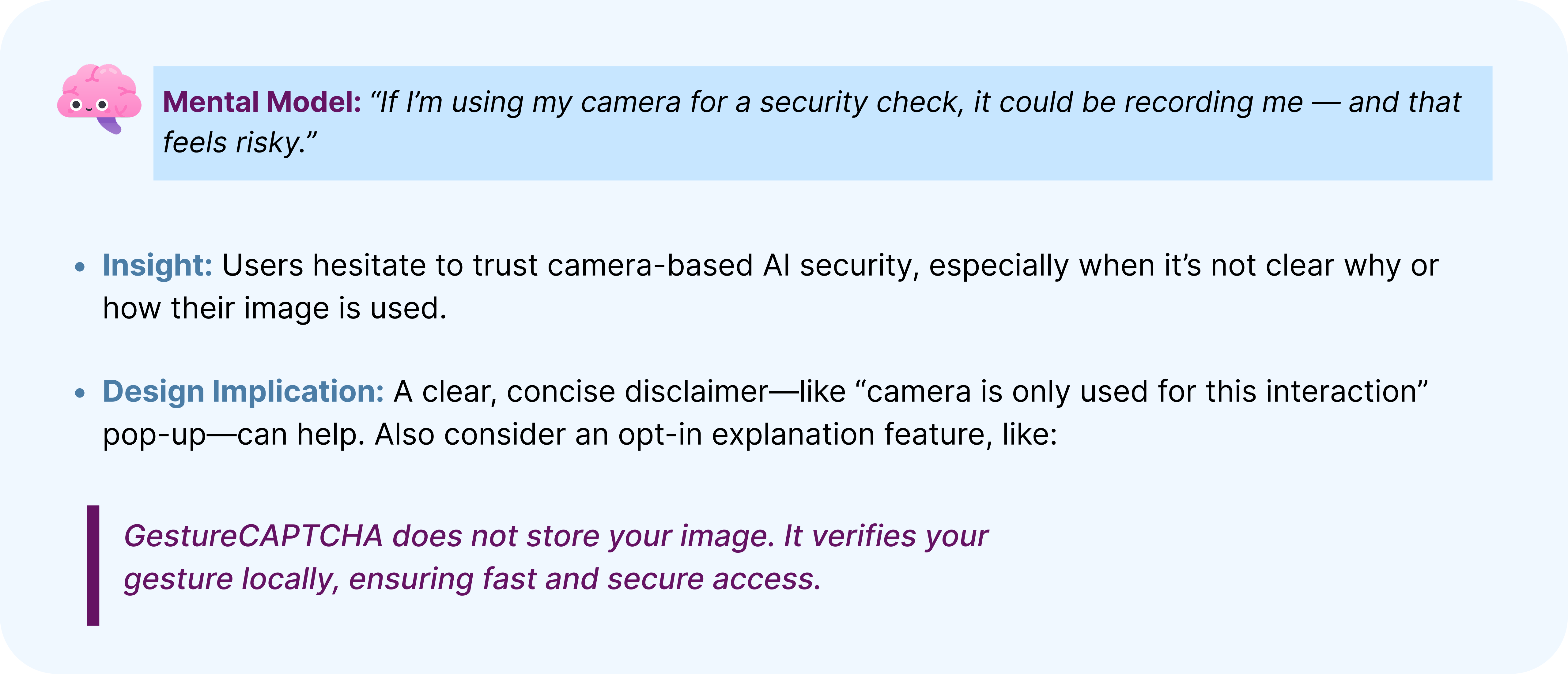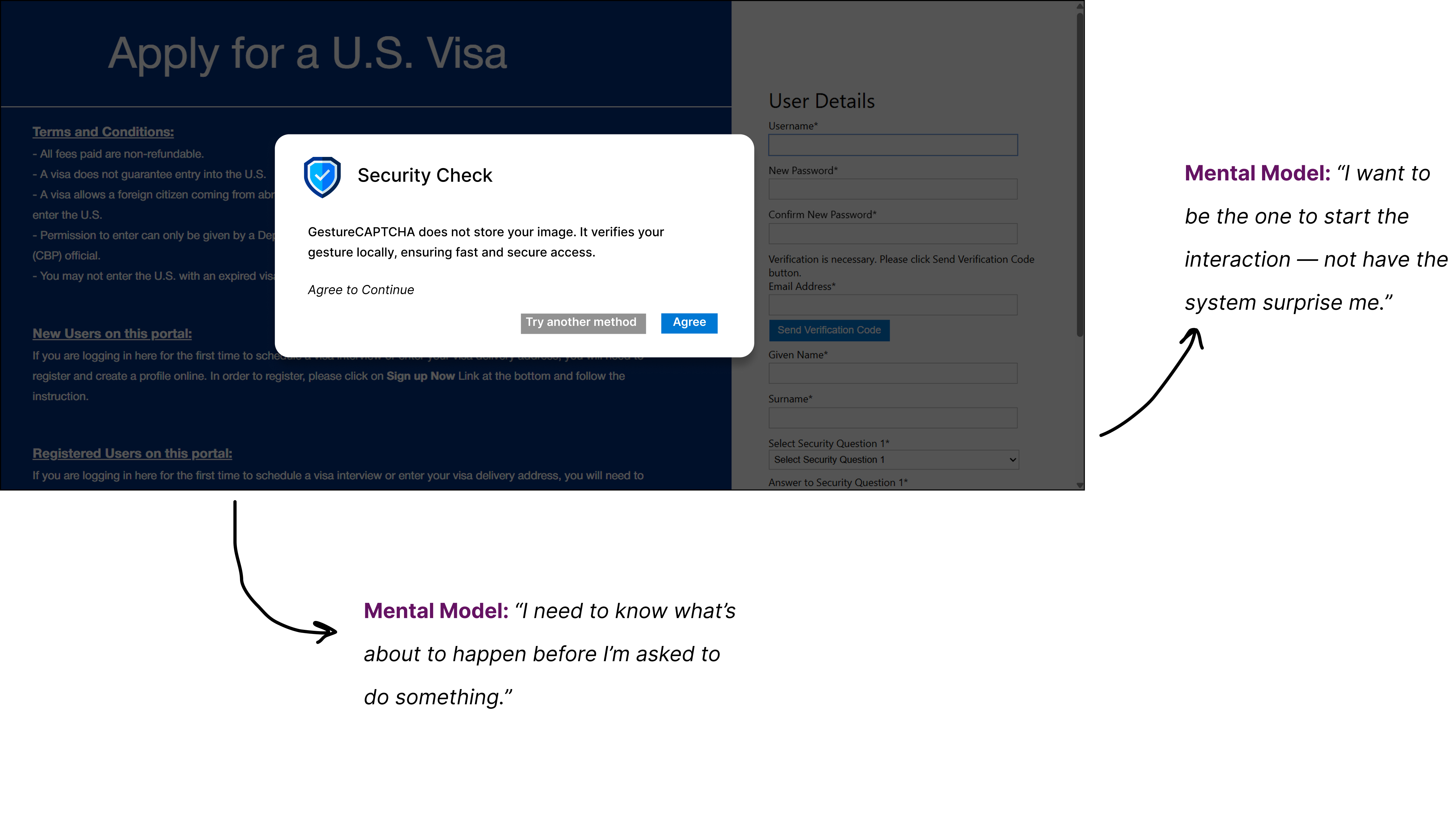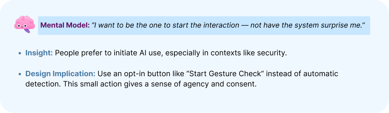 My approach to this project stems from a strong interest in observational user research, specifically analyzing how individuals naturally interact with their environment and leveraging those insights to develop intuitive and user-friendly technological solutions. I think if you really get that, you can make tech way easier and less annoying. So, when I was brainstorming about security, I wanted to find ways to prove you're a real person and not a bot, but also that doesn't drive users crazy.