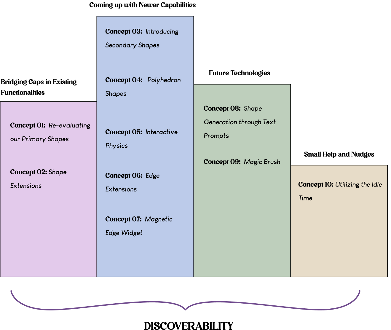 As observed in our explorations, we encountered numerous challenges to address. However, a prominent issue that stood out was the deficiency in discoverability. Recognizing this as a central concern, I decided to anchor our concept around discoverability and sought to integrate other pillars and concepts within this framework.