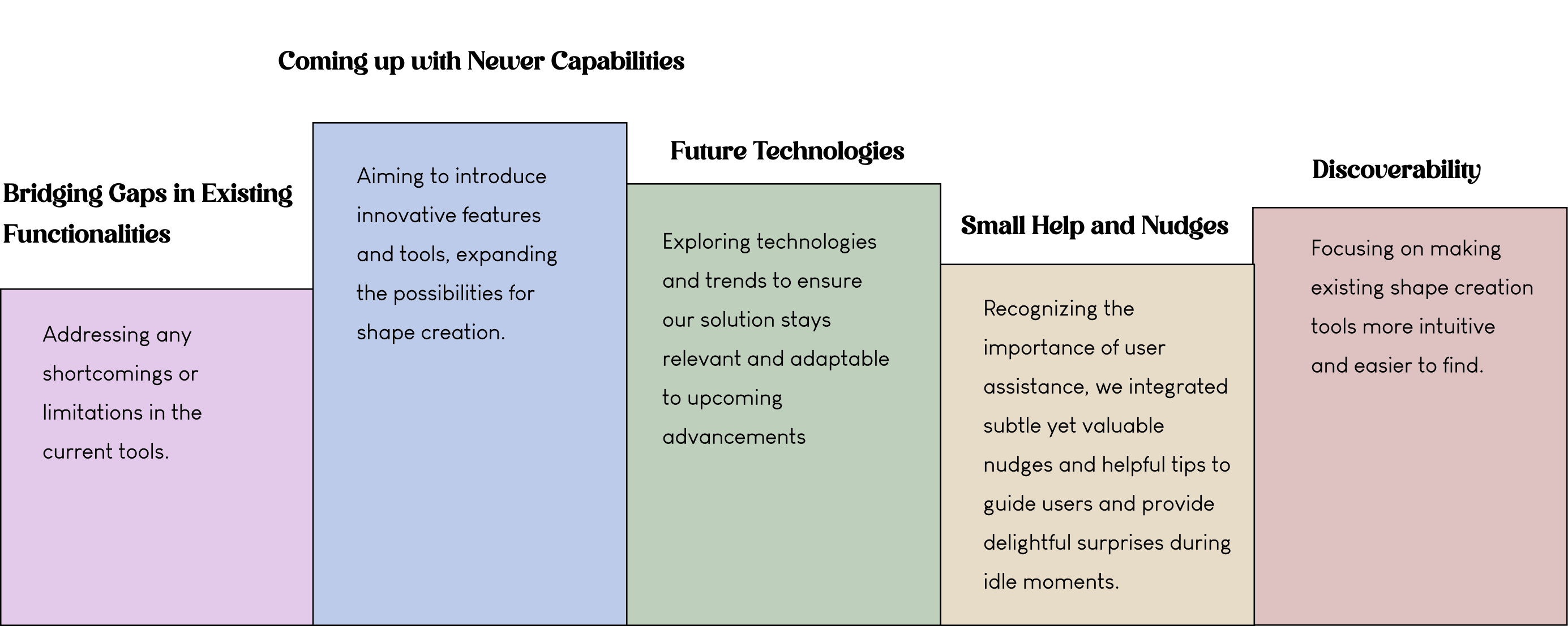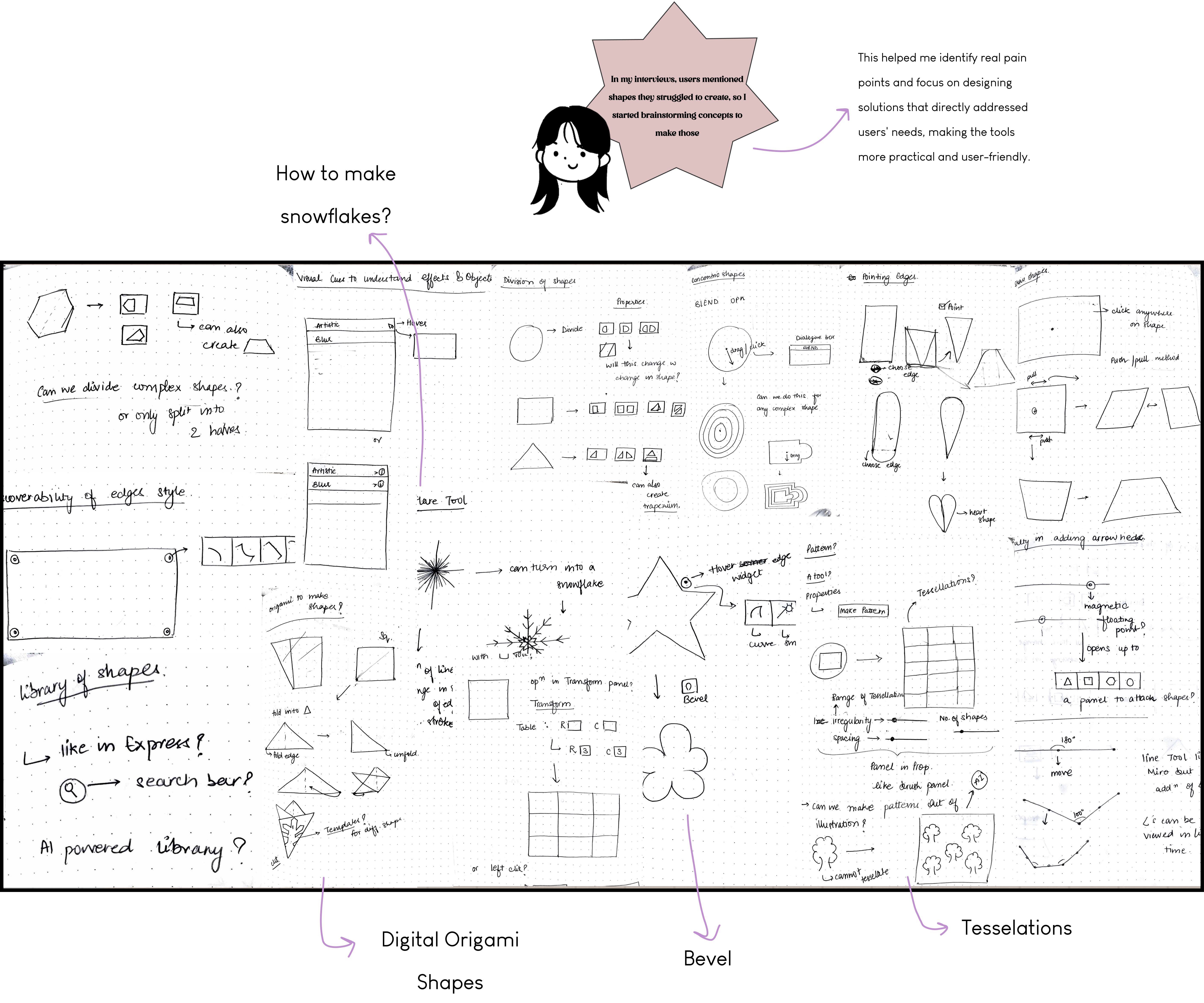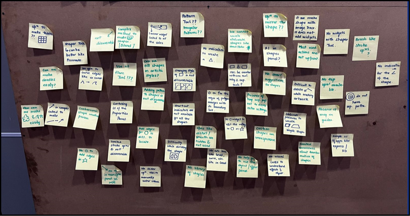 In the next stage of the process, I compiled all the issues identified during my research — combining insights from user interviews, competitive analysis, and the initial audit. This helped me clearly map out both user pain points and design limitations within the current Shape Tools.